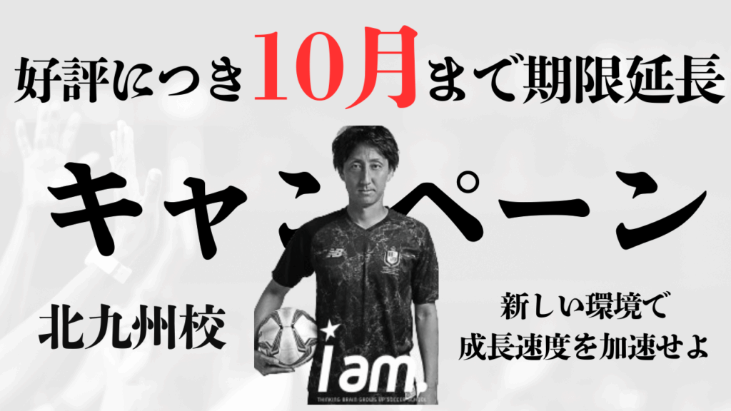 9月に実施した〝期間限定″のキャンペーン〝大好評″につき10月まで〝期間″を延長して実施致します。 少しでもiam.サッカースクールに興味を持った方 まずは無料体験で〝ホンモノ″のスクールを体感せよ👍 詳 … 続きを読む 【北九州校】(小倉南校•小倉北日明校)お得なキャンペーンのお知らせ